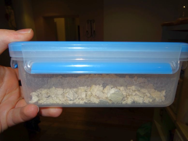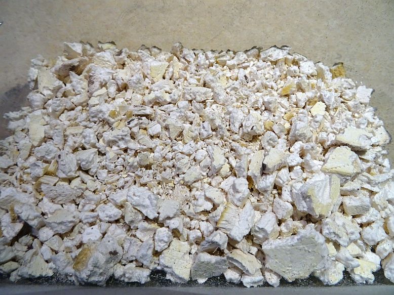 Wenn die Pilzstücke vor dem Zerkleinern wirklich absolut trocken waren und das Granulat sauber verarbeitet wurde, dann ist es in einer luft- und vor allem feuchtigkeitsdichten Box im Vorratsschrank bei Zimmertemperatur (siehe letztes Foto) locker ein Jahr und länger haltbar.