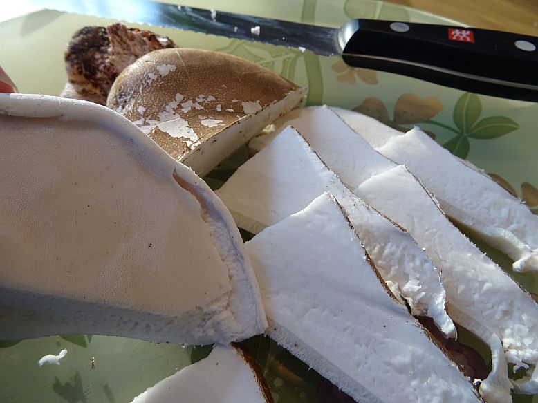 2. Es gilt möglichst junge Fruchtkörper zu ernten, diese sind oben hellbraun, glatt und unten an den Poren schneeweiß. Bei genauem Hinsehen kann man die winzigen Poren gut erkennen.